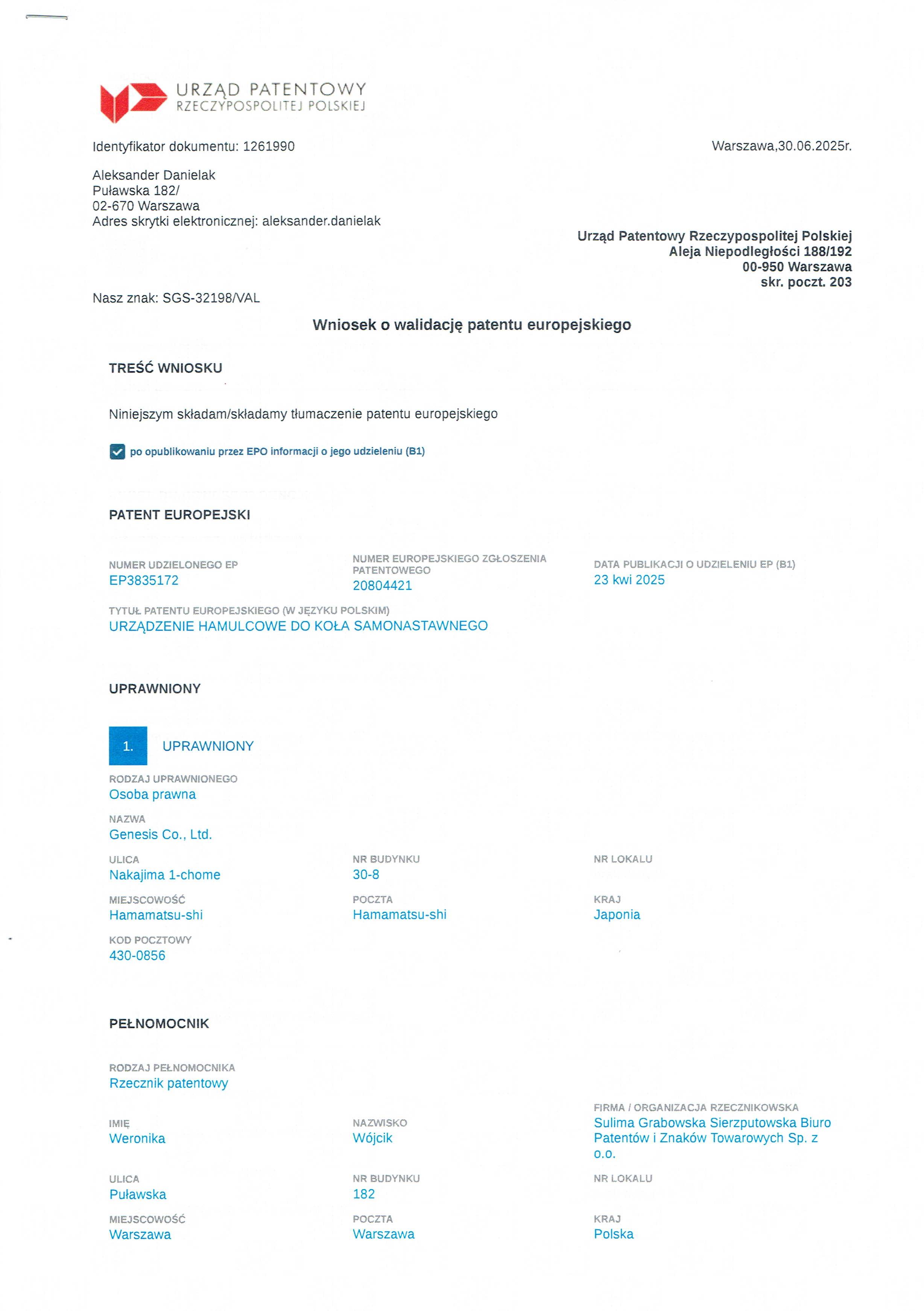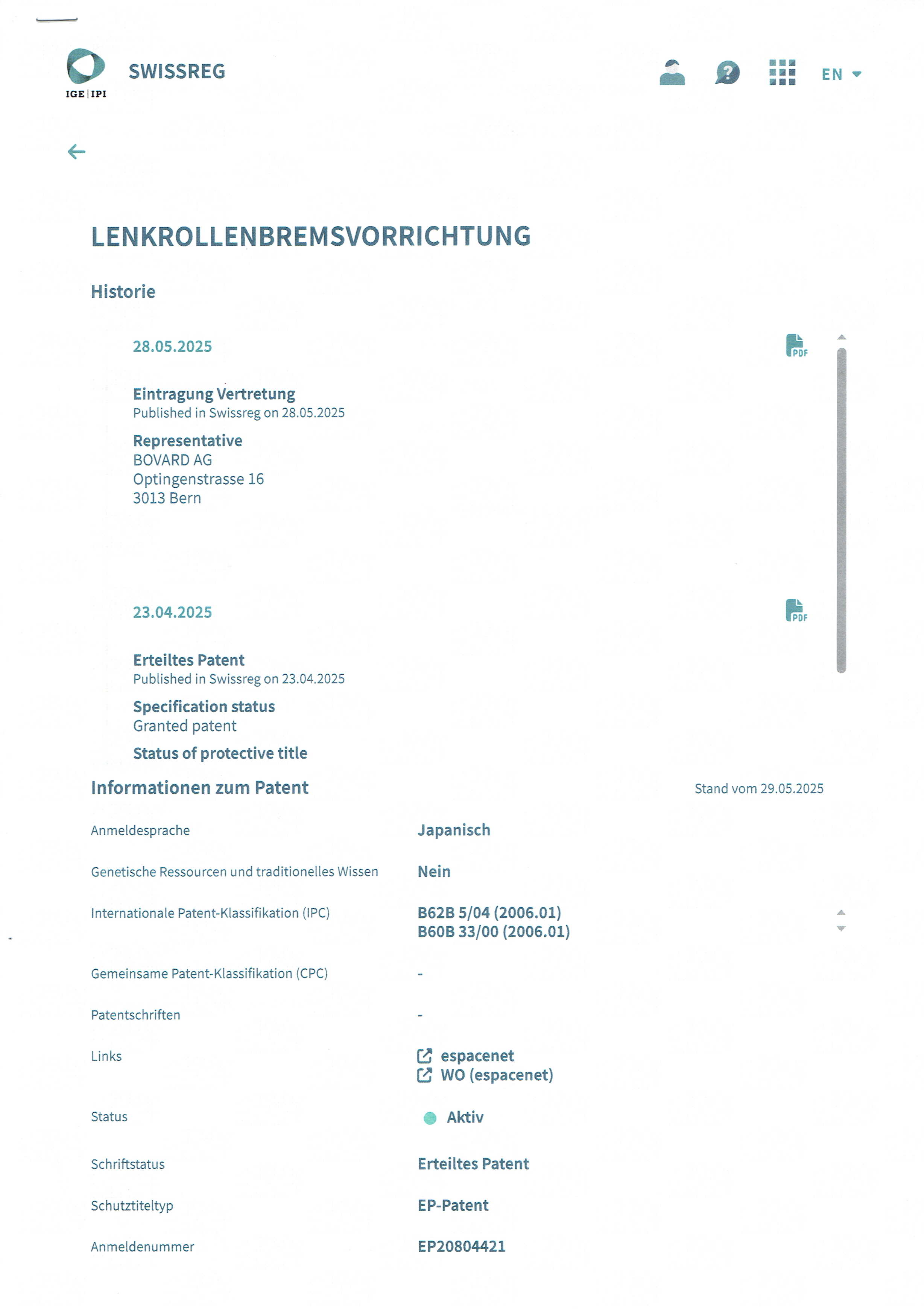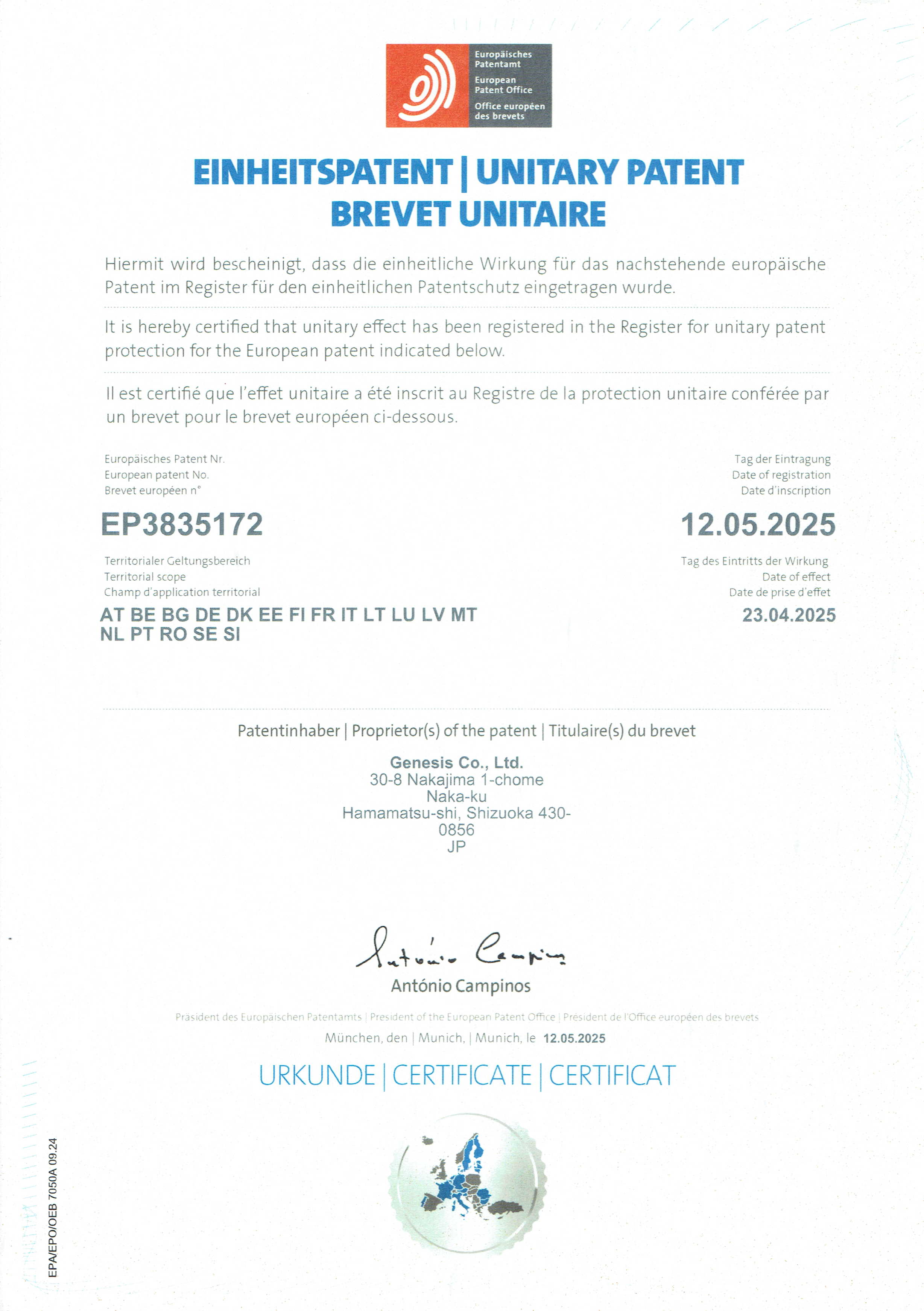 - 2025年04月23日 スイス・リヒテンシュタイン 特許第3835172号