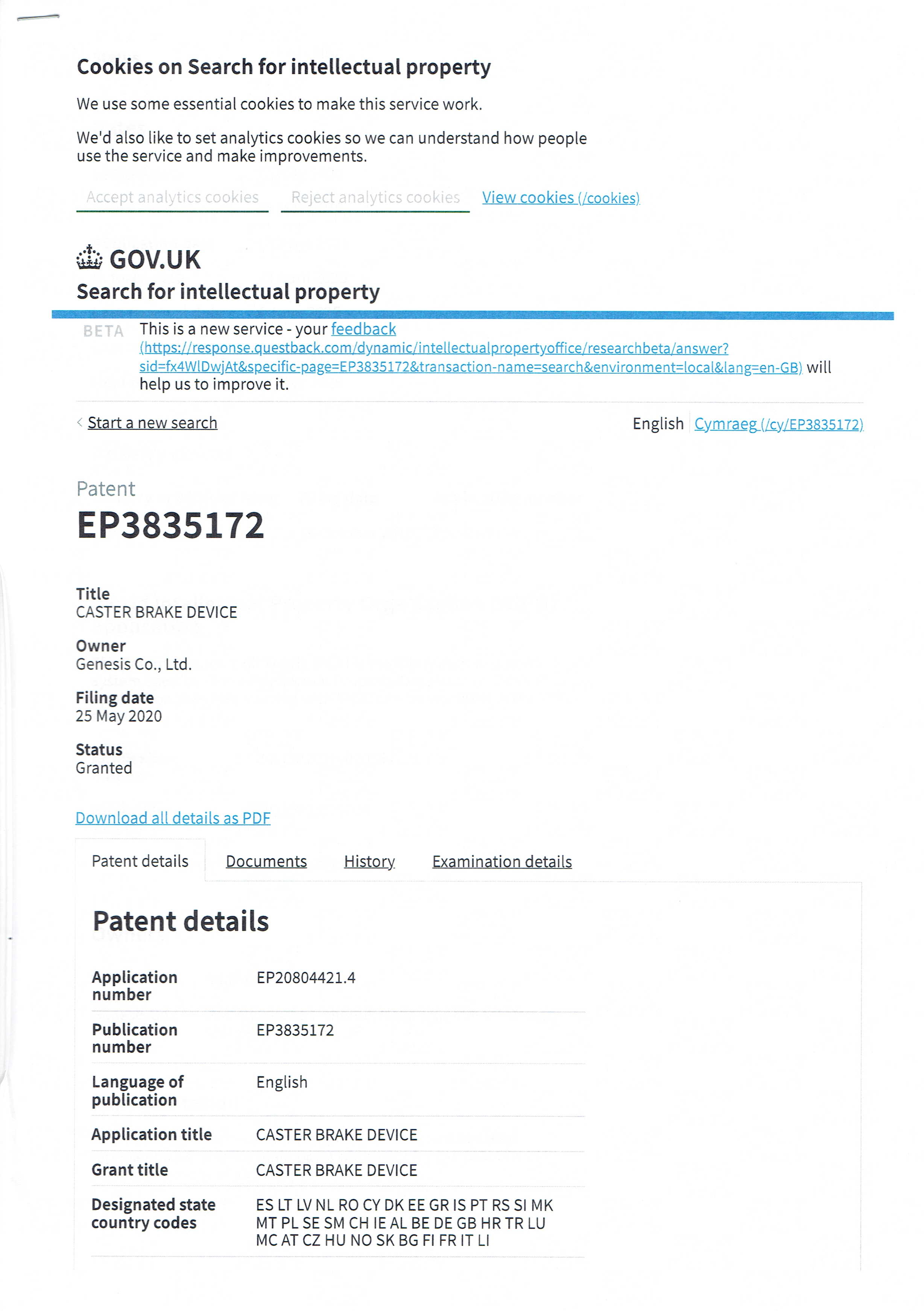 - 2025年06月04日 イギリス 特許第3835172号 「キャスターのブレーキ装置」登録済み